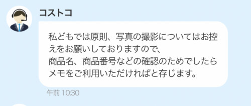 なので、写真撮影して良いかコストコにチャットで問い合わせてみたのよ。