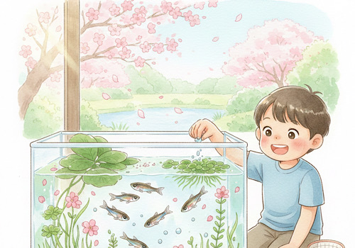 冬が終わり、春になって、メダカを確認。
