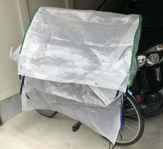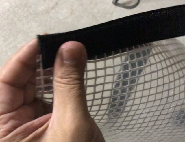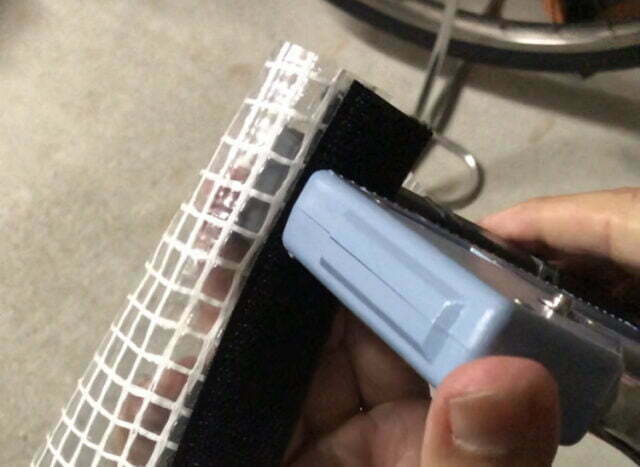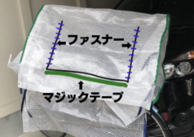 ベルトとマジックテープでビニールシート挟むように取り付けます。