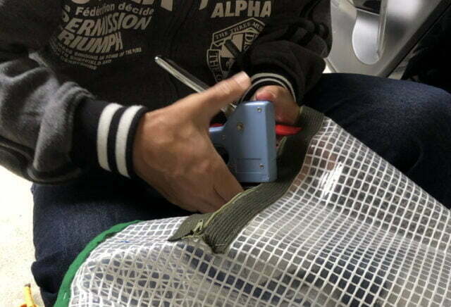 ビニールシートとベルトの端を合わせてホッチキスで止めます。