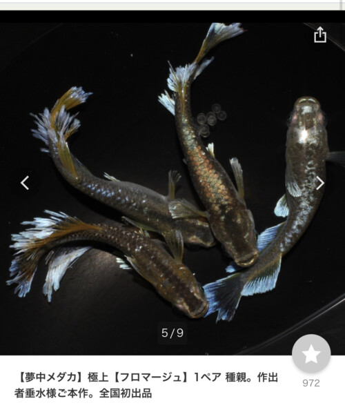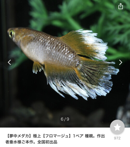 少し前に販売した、【ミッドナイトフリル】は、色飛びしない黒体色に、体外光、ラメ、そこに」ロングフィンを併せ持ったメダカでしたが、今回販売の【フロマージュ】は、兄弟魚の中でも、【ホワイトアウト】と1,2位を争うくらい、ヒレ中の白い結晶を多く持ち、また、豊かなロングフィンが発現する性質を持ったメダカです。色飛びしないメダカ作りが期待出来るメダカだと考えており、今後の皆さんの改良に期待するところです。