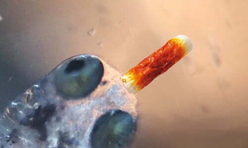針子の口の大きさとゾウリムシの大きさを比較した画像が