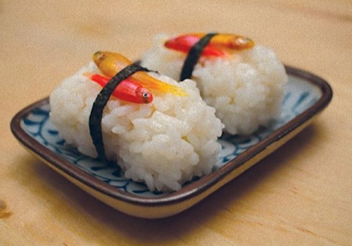 この遺伝子組み換えの熱帯魚を使った寿司なので、ライトを当てると光る