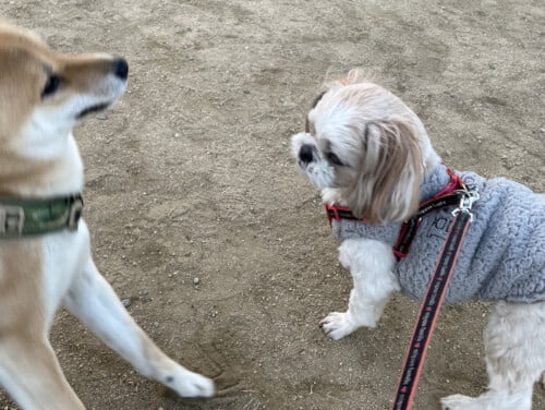 マロがガウっと行くと素早く逃げる風ちゃん。