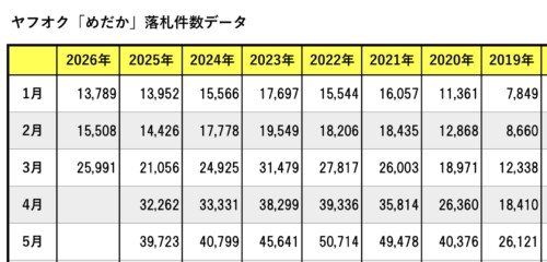 ヤフオクのメダカ落札件数からトレンドを見ていきます。(クリックで大きくなります)