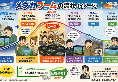 いわゆる“おうち時間”でメダカ飼育に人が流れ込んだ結果です。