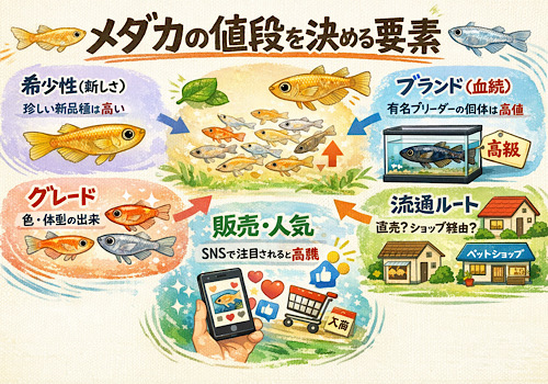 メダカは繁殖力が高いので、数が増えると市場に出回り価格が下がります。