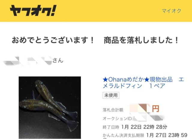 無事、「Ohanaめだか」さんより落札出来ました。😊