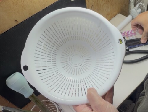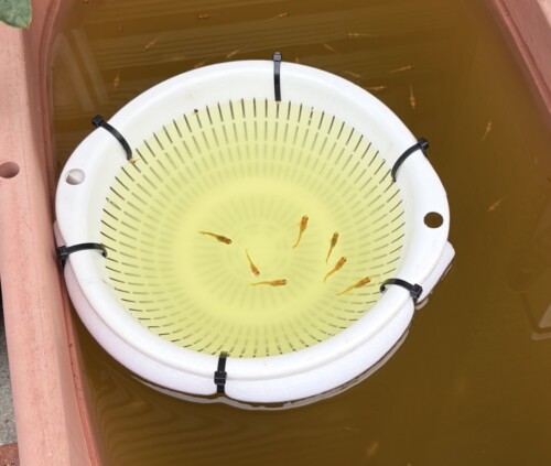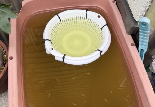 ザルにミジンコを放り込むと、少しづつ出ていく事で自動餌やり器になる